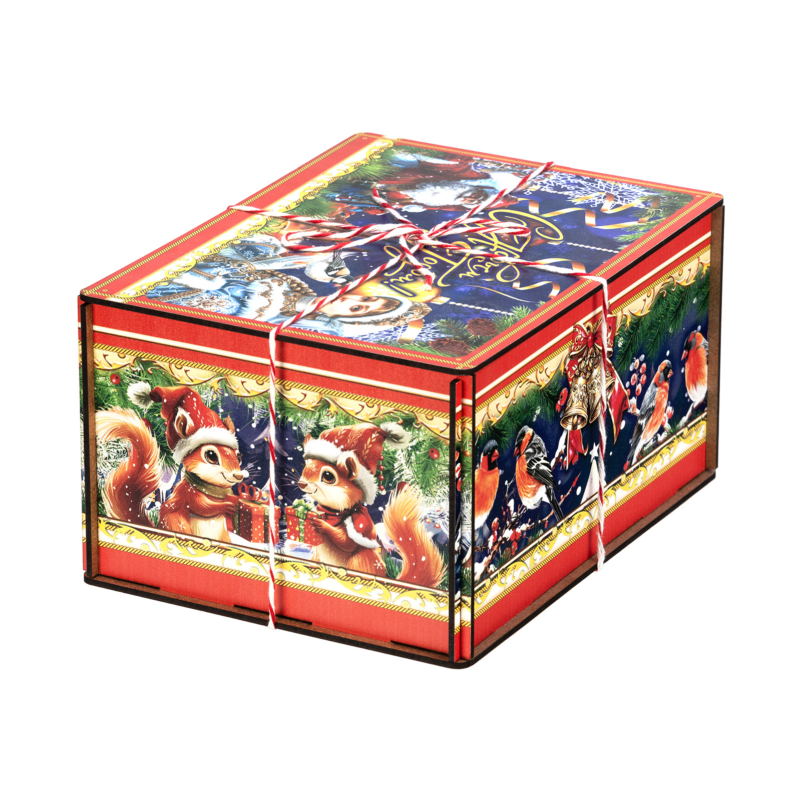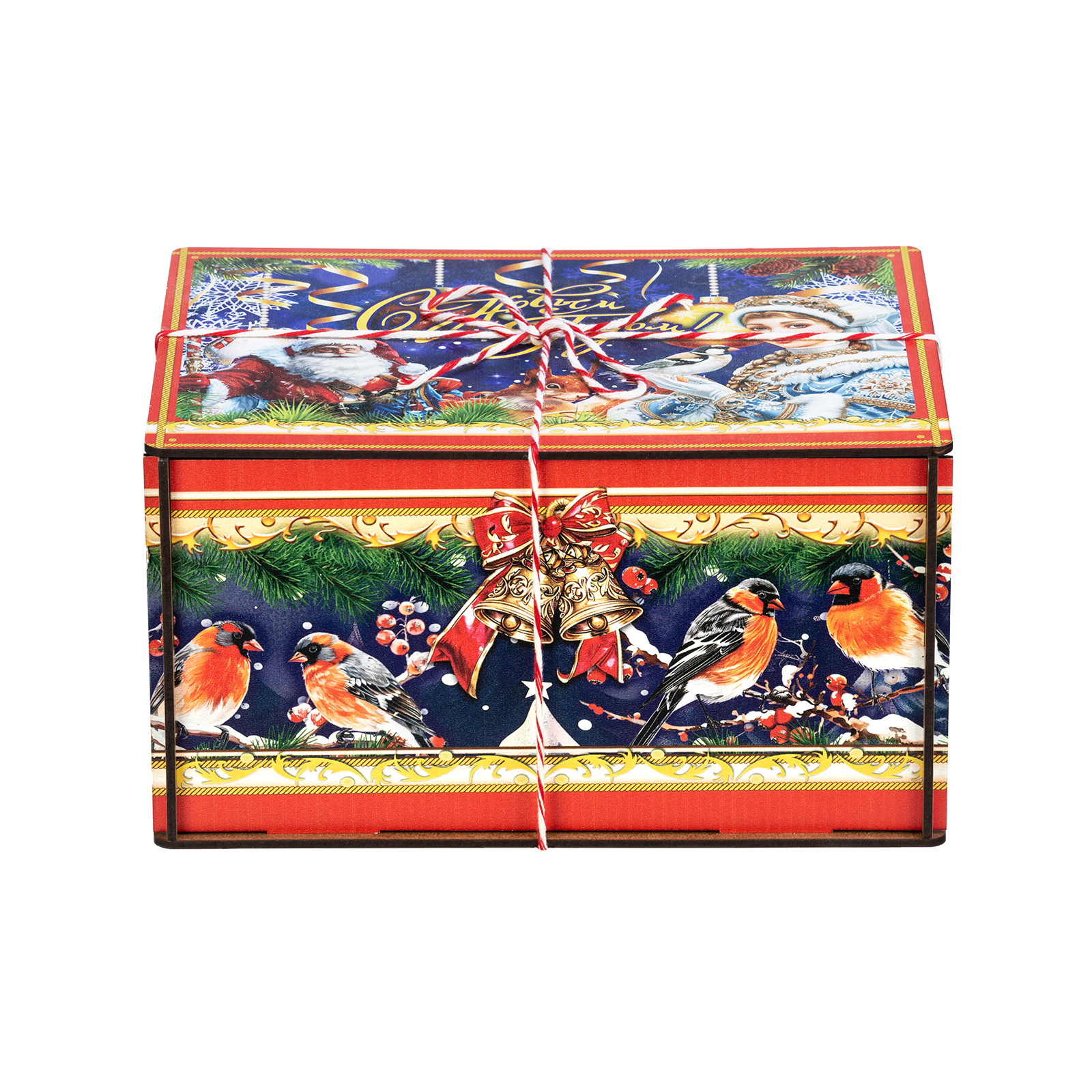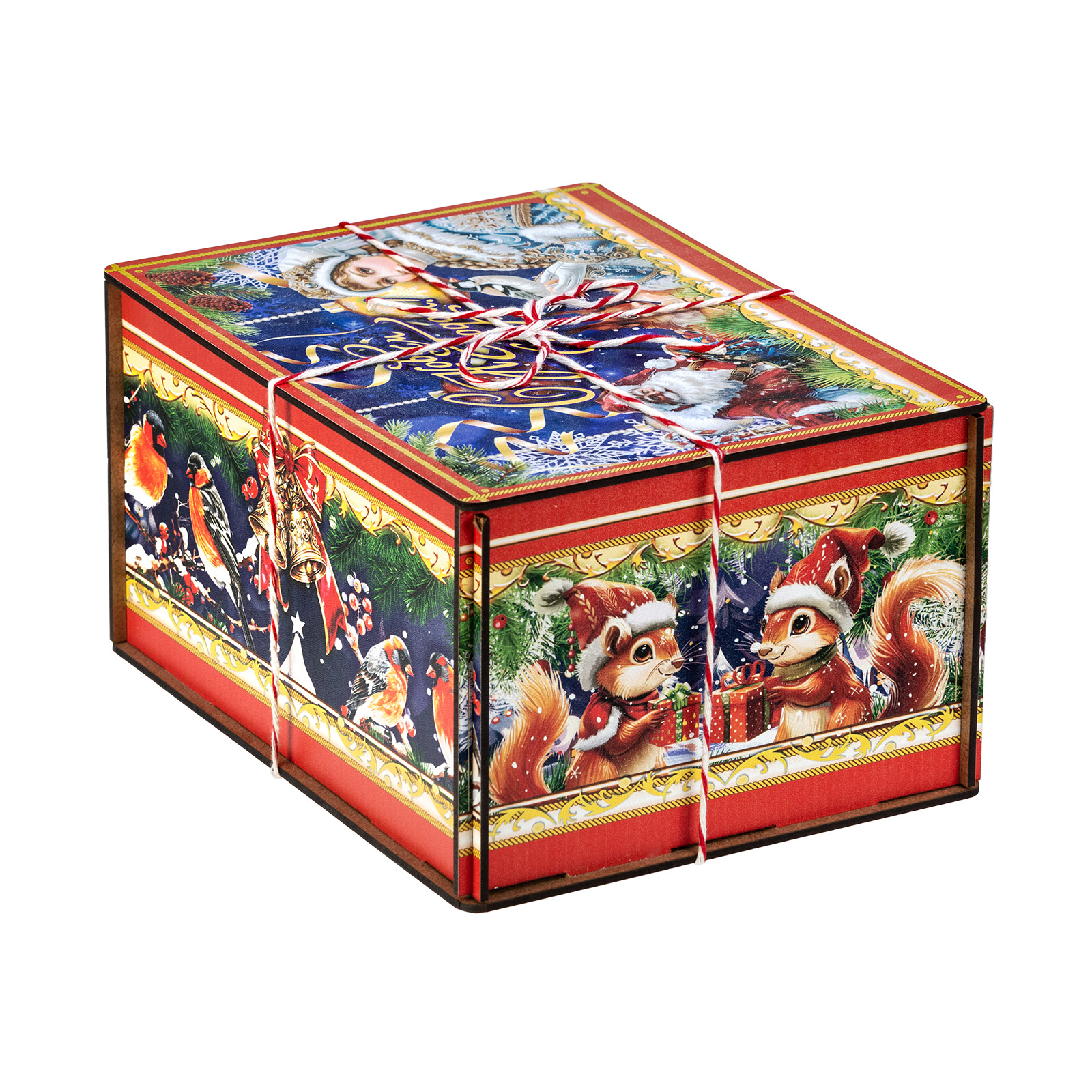 “Мелодия зимы” - это подарочный набор в деревянной упаковке, который прекрасно подойдет в качестве презента для подростка или взрослого. Это небольшой деревянный ящик, пестро украшенный со всех сторон разнообразными яркими иллюстрациями. На боковых гранях нарисованы лесные обитатели, а на крышке красуется изображение главных праздничных героев: Дедушка Мороз и Снегурочки. В состав подарка входит полтора килограмма кондитерских изделий на любой вкус, а также небольшой памятный сувенир в виде символа 2026 года - очаровательной лошадки. Благодаря такому подарку воспоминания о новогоднем торжестве останутся с вами на долгие месяцы.
