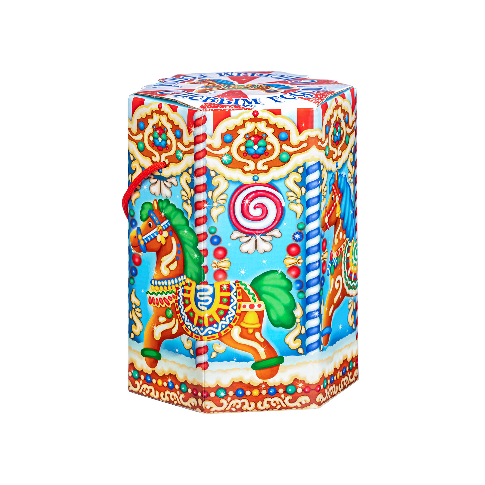 Интересный вариант новогоднего подарка – «Пряничная карусель». Он представлен в разделе Картон. Отлично подойдет на подарок в 2026 году с символом Лошадь. Внутри такого презента находится кондитерский набор весом 800 граммов.
